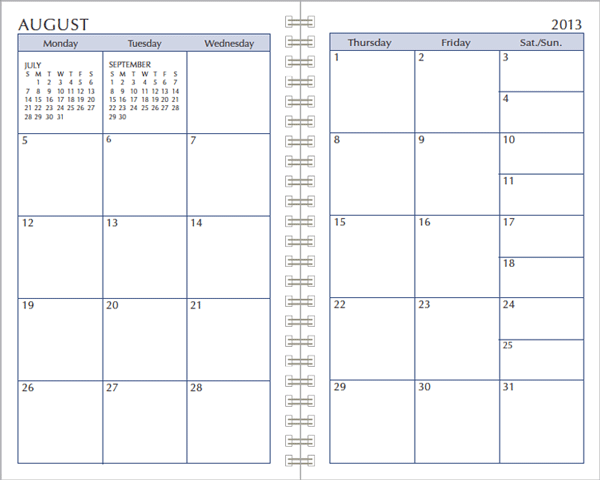 Top grain leather planner covers. Measures 8 1/8" x 5 3/4" x 7/8". Holds 7 3/4" x 5 1/2" inserts. A weekly calendar planner is included. The left side has two business-card slots and two inside pockets. The right side has both top-loading and side-loading pockets. Elastic pen loop (pen not included) .